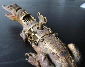 An artistic genre I’m particularly fond of is Steampunk, which re-tells the past as it might have been, had technology stopped with the steam engine. Everything is ‘modded’ with brass and wood, very ornately and, usually, excentrically. And you can’t get much more excentric than a wind-up alligator.