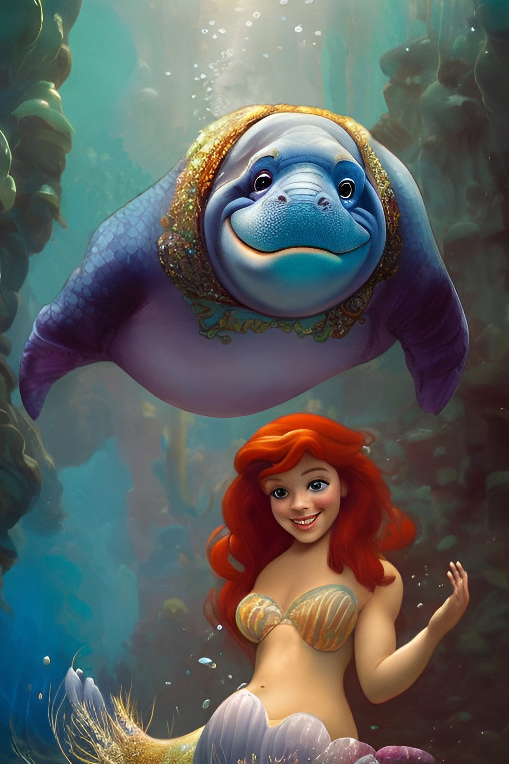 So, that’s manatees. And mermaids? It seems far-fetched but most of us have heard the story that these ponderous animals gave rise to the legend of the mermaid. The familiar tale – at least the one I always heard – is that lonely seamen in the West Indies saw manatees at a distance nursing their young out of the water (something for which I’ve found no evidence at all) and imagined they were marine goddesses with long tresses and graceful arms. I don’t see it personally, and I’m now imagining Hans Christian Andersen rocking “The Little Sea Cow.” Disney’s definitely missed an opportunity here.