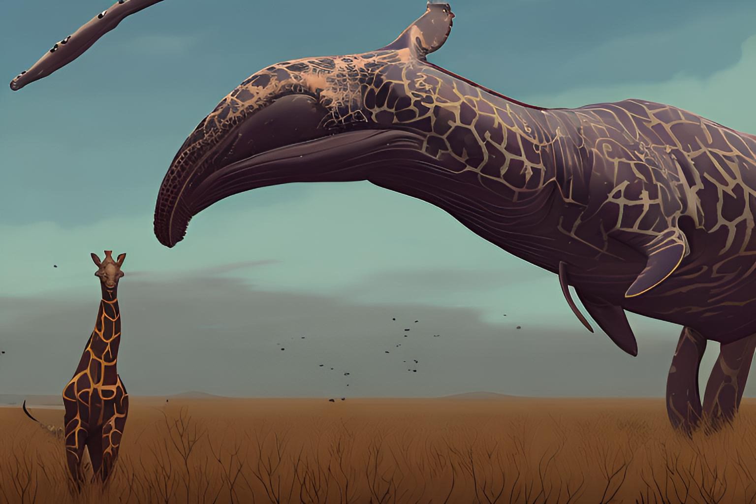 I used AI (Wonder) to illustrate this evolutionary phenomenon. The glaring mistakes include two necks, ten legs and visual acuity at night (apparently used while traveling in a flock). However, undaunted, I twiddled some knobs and asked “Are whales and giraffes related?”
