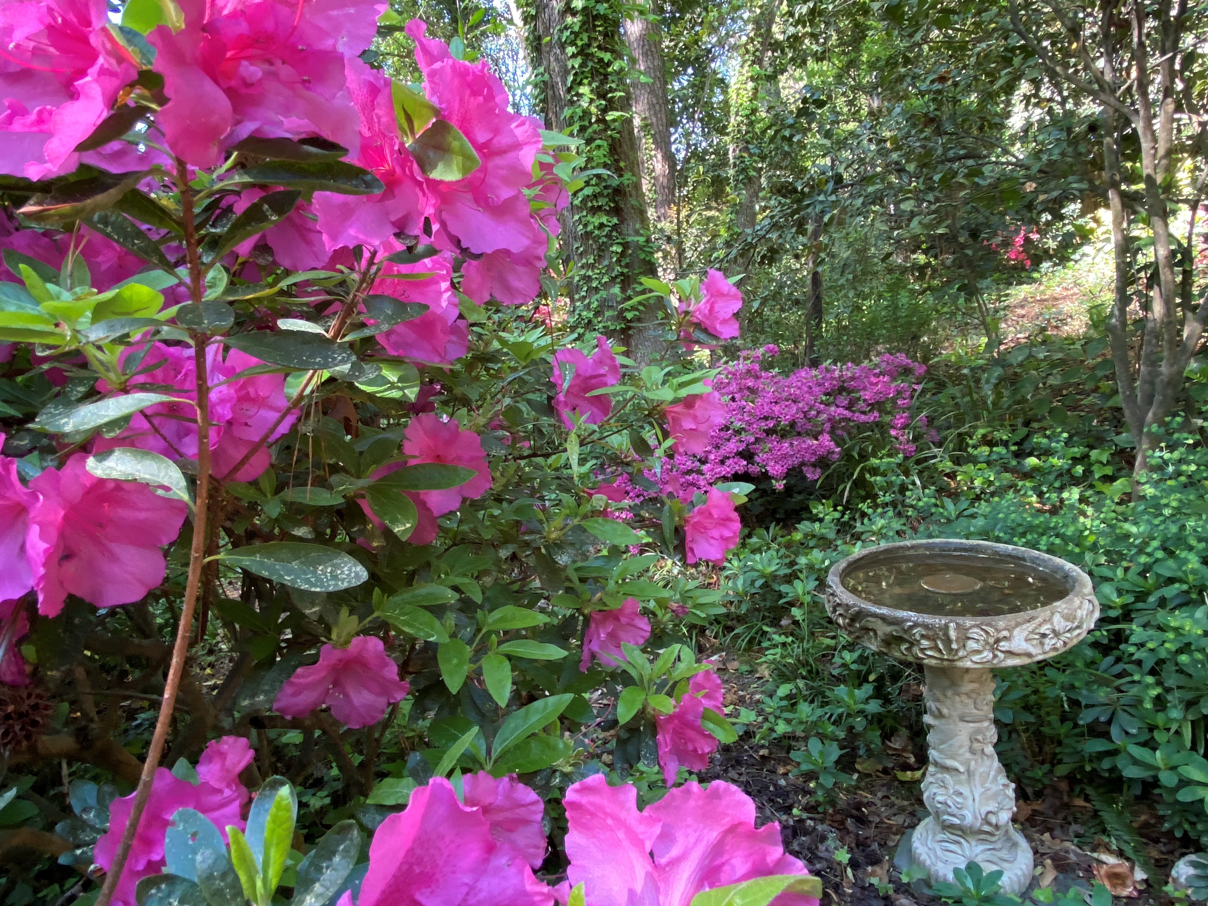 I’m glad I was able to stay in Raleigh long enough to see this garden at its verdant best. Towering magnolias, oaks, and pines shade bluebells, camellia, gardenia, and honeysuckle scrambling together in a profuse riot of green, punctuated with specks of pink, yellow, blue, and white. The bird feeders have meant that the visual feast has been accompanied by as full a profusion of sound. It validates the reasons we registered it as wildlife habitat with the National Wildlife Federation.