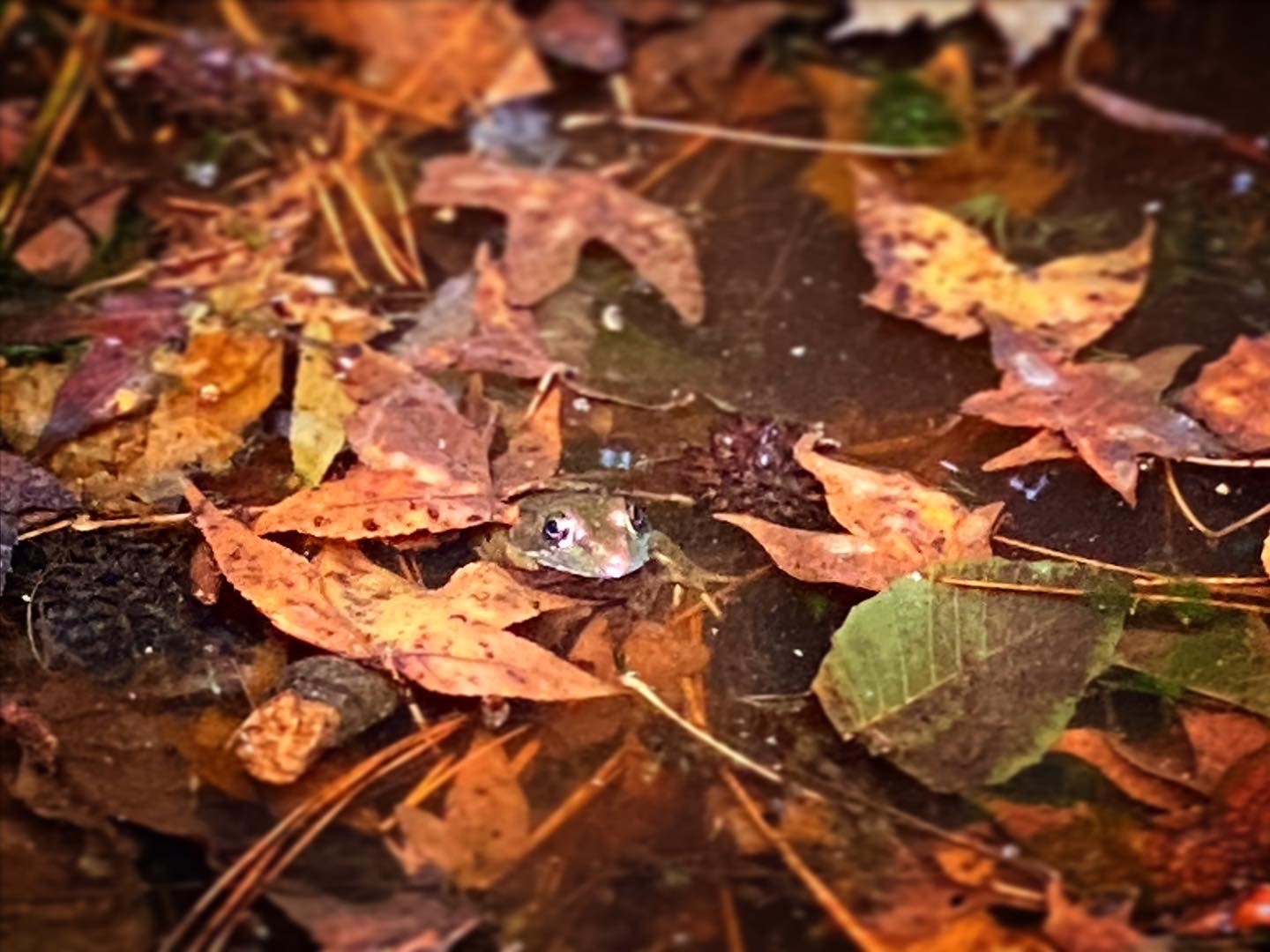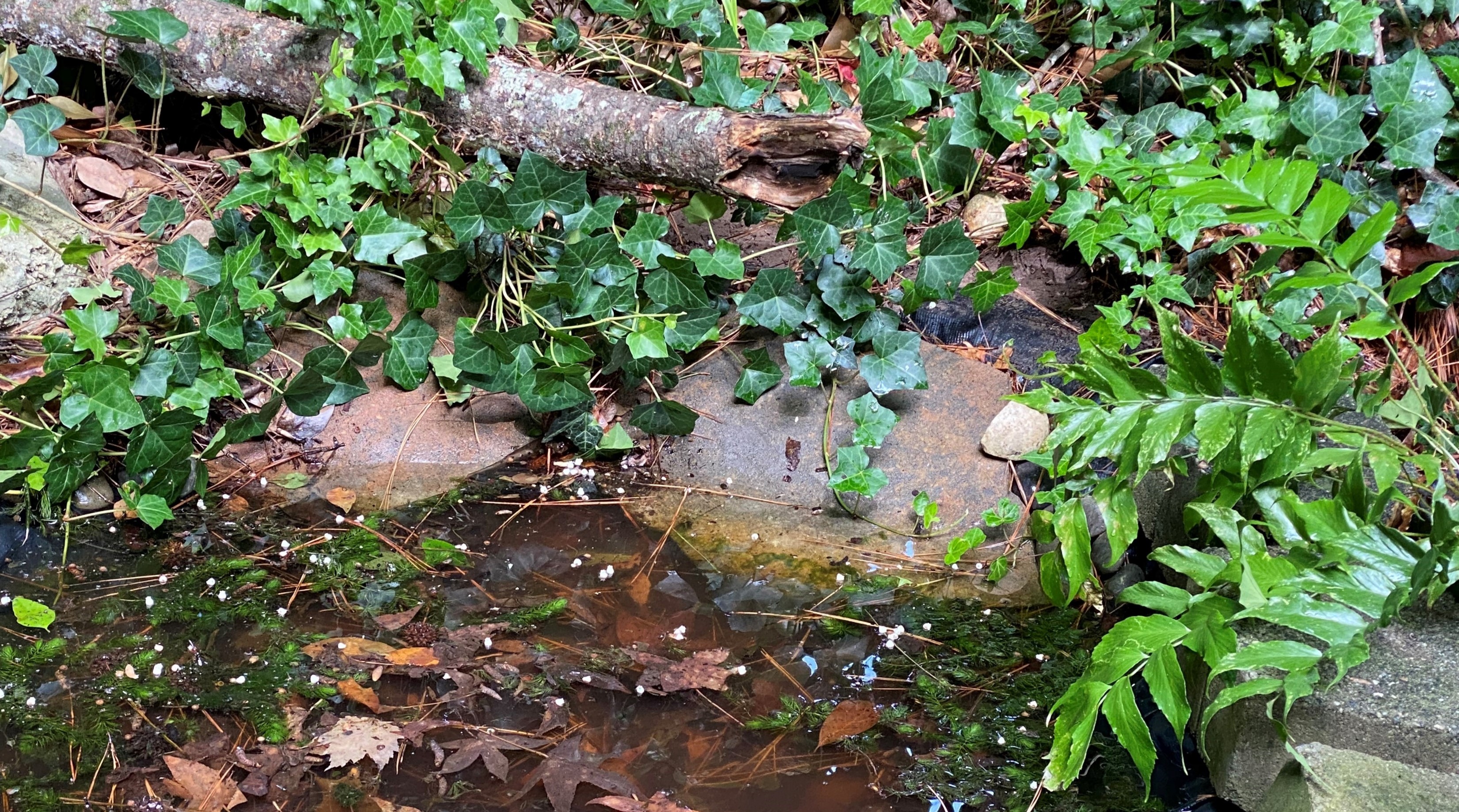 It seems incredible that it was three weeks ago that I dragged my overstuffed bags past the sun room and caught a final glimpse of the frog pond I created, observed, fretted over, and about which I’ve shared in couple of times in blog posts. As we gear up for a new life in Kansas City, with all the excitement that entails, I have to reflect on this verdant little microcosm. Its steep walls are now less obviously covered in black plastic, now that the ivy and other plants have had a year to grow in. It’s more diverse these days and the sticks and leaves that have fallen in have created a complex bottom.