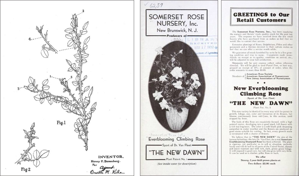 One of the things I love about working at the Linda Hall Library is the frequency of which I’m exposed, often unexpectedly, to really cool books. One book, or rather a series of books, is the collection of United States plant patents from the very first to the most recent. The very first patent, in fact “Plant Patent 1”, is for a climbing rose (“New Dawn”), applied for on August 6, 1930 by Henry F. Bosenberg of Somerset Rose Nursery New Brunswick, New Jersey.