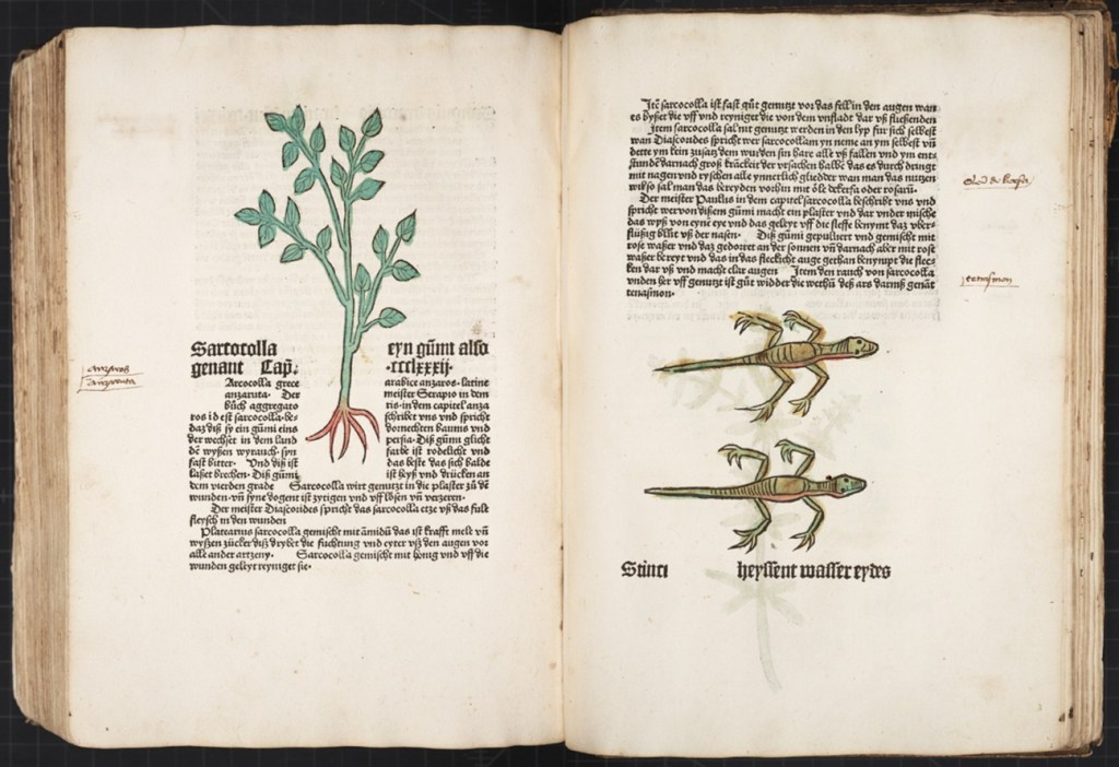 While many of the medical practices in Gart der Gesundheit were completely wrong, and quite a few even dangerous, the book served to expand the reach of medical knowledge by moving from manuscript to print. For the first time, physicians and lay readers alike could consult the same illustrated compendium in their own language. Its woodcuts gave recognition to plants and animals that many readers would never encounter in person. This book established a model of systematic classification and communication that later herbals and pharmacopoeias continued to develop. Modern pharmacology still follows that impulse to link natural forms with healing. This book appears in The Grandeur of Life , an online exhibition on the Library website.