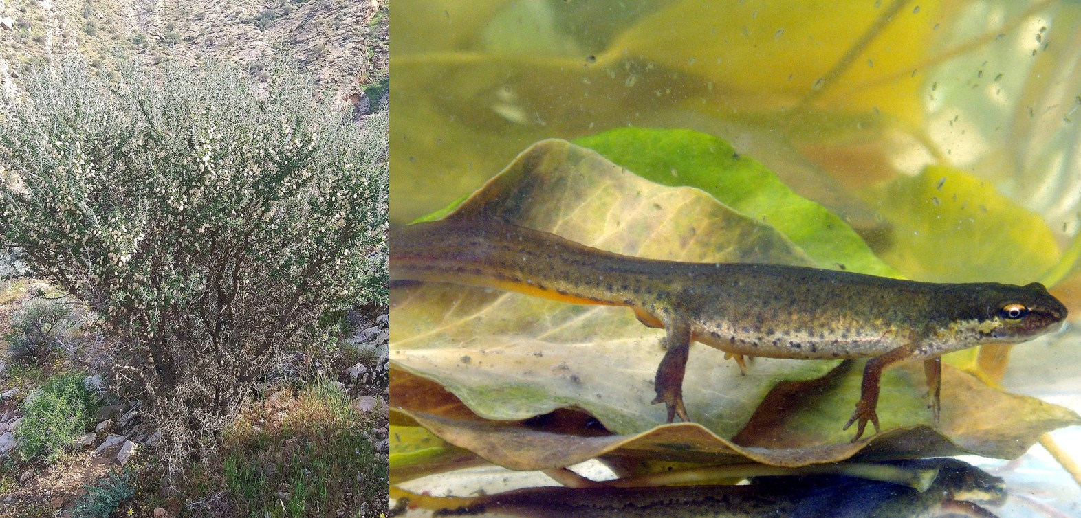 The particular page open has to do with afflictions of the eye. While names have changed, it seems most likely that the plant on the left is Persian Gum Astragalus sarcocolla, used for its resin, and the “water lizard” on the right is the common newt Lissotriton vulgaris, which was more associated with its moist skin and habitat that any real utility.